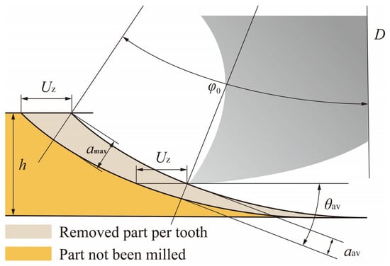 where aav is the average chip thickness (mm/t), θav is the angle of motion when milling speed direction at the midpoint of the contact arc is used as a calculation basis (°), φ0 is the contact angle (°), h is the milling depth (mm) and D is the diameter of the tool (mm).