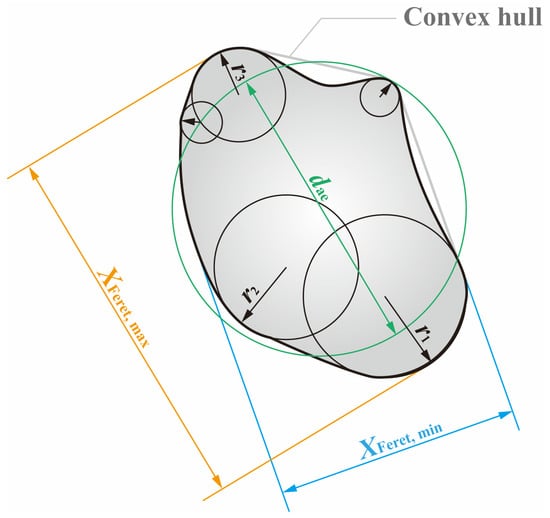where R is roundness, and ri is the radius of the inscribed circle at convex corner i. Particles with a roundness close to 1 had a smooth profile similar to that of a circle, which leads to better flowability than particles with sharp edges and corners [37].