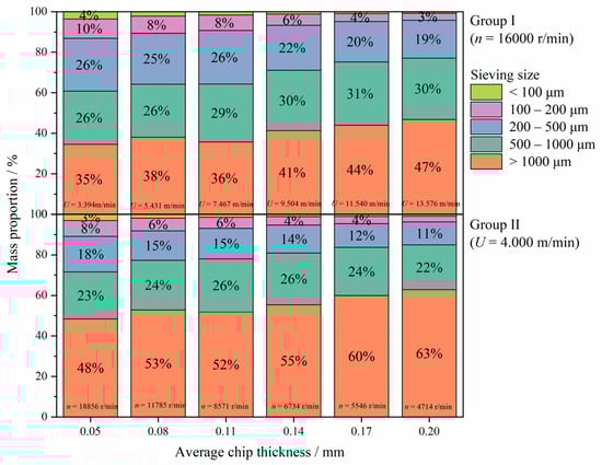 It was also observed that the mass proportion of dust larger than 1000 μm in group I was less than that of group II under the same average chip thickness. On the contrary, mass proportions for the other dust particles in group I were higher compared to those in group II, indicating that it was easier to generate large particle dust by reducing spindle speed rather than by increasing feed rate when average chip thickness was fixed. This may be attributed to spindle speed that exerted a comparative impact on milling speed, which played a decisive role in the damage to materials in the cutting layer.
