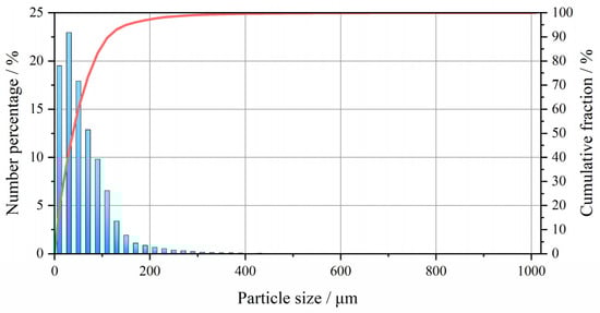 Usually, small particles presented relatively low mass proportions [40], which have large specific surface areas and strong cohesion with each other, leading to a more stable structure and lower flowability. However, the quantity of large particle dust was not on the same order of magnitude as that of small particle dust, and mass distribution could not completely reflect the proportion of the actual quantity of dust particles. A large quantity of fine particles causes occupational hazards to workers and reduces the precision of equipment. The cumulative curve for PSD and number percentage in Figure 6 indicates that more than 83% of bamboo particles (≤ 100 μm) are classifiable as inhalable fraction, according to the American Conference of Governmental Industrial Hygienists (ACGIH) [41]. Thus, it was essential to independently analyze morphological characteristics of bamboo dust below 100 μm.