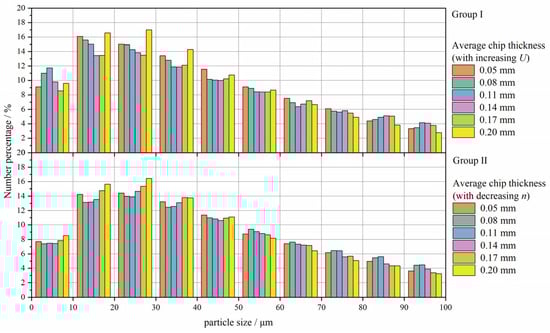 Dust with a wide particle size distribution was reported to have high unconstrained yield strength [42]. Dust particles within 100 μm can easily form a relatively stable structure with each other, leading to low flowability, since they have large specific surface areas and stronger cohesive forces [43]. Figure 7 displays the PSD of particles within 100 μm. In group I, the largest number part was the particles in a range of 10–20 μm, accounting for 13.4%–16.6%, while it was between 20–30 μm for 13.9%–16.4% in group II. It was inferred that the smallest visible debris generated on the bamboo surface after being cut and destroyed by the milling tool was concentrated between 10–50 μm. In general, PSD tends to be discrete with an increase in feed rate, but it changes in the opposite manner with a decrease in spindle speed. These results suggest that an increase in feed rate reduced the ability of bamboo fragments to split into smaller debris. Seemingly, a reduction in spindle speed made the finest dust more concentrated. While based on the fact that the proportion of dust within 100 μm in group II was lower than that in group I, it is reasonable to suggest that decreasing spindle speed transferred particles originally located at 50–100 μm to the components above 100 μm. This also explained the abnormal opposite trend in group I when average chip thickness was 0.20 mm, and When the average chip thickness was 0.05 mm; these thicknesses may be attributed to the extremely high feed rate and spindle speed used, respectively.