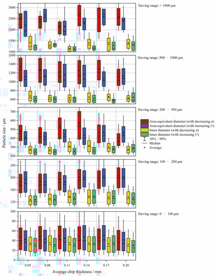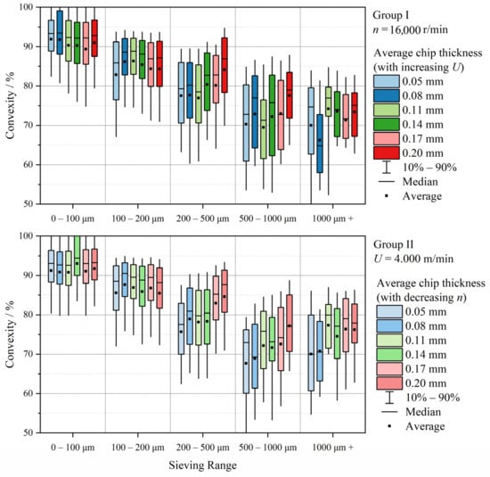 Figure 13 showed that the convexity of bamboo milling dust showed similar and more obvious trends with AR and roundness. Nevertheless, the convexity of bamboo dust larger than 200 μm seemed to be positively correlated with average chip thickness. The median convexity of particles decreased from 93.3% to 62.3% with an increase in particle size, which demonstrated that large particles had more hollows and defects. Contrary to MDF sanding dust, a wider distribution was revealed in the convexity analysis of bamboo milling dust [30]. Bamboo fibers were broken, with irregular erosion surfaces after interacting with the tool blade, the panel surface and with other particles, resulting in small, short and smooth particles. High convexity indicated fewer concave positions on particle surfaces, which can thereby be characterized as flat or smooth surfaces, whereas low AR and convexity values show the occurrence of full breakage and surface erosion of wood fibers during the milling. Still, the influence of average chip thickness on convexity was almost the same as that on the AR.