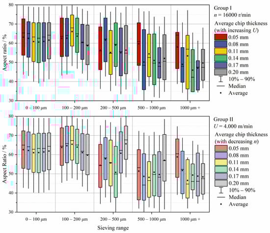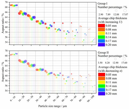 However, except for some errors caused by outliers, the median value of din obtained by continuously reducing spindle speed at a low feed rate (in group II) was generally larger than that obtained by increasing the feed speed at a high spindle speed (in group I) under the same average chip thickness. This suggested that the size of particles generated by a high spindle speed was lower than that produced by a low feed rate. This means that in practical production, particle size can be optimized by appropriately controlling spindle speed and feed rate. Meanwhile, the instability of dae was more closely related to specific morphologies of the particles.