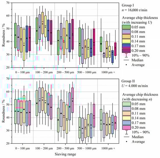 Figure 11 shows that the roundness of bamboo milling dust shared similar tendencies with the AR. The maximum median roundness decreased from 55.5% to 29.0% with an increase in particle size, which demonstrated that larger particles had more corners and irregular edges. The roundness of bamboo milling dust was lower than that of particleboard drilling dust, which may have resulted from the rake angle of tool used, and material characteristics [44]. The roundness distribution of bamboo particles gradually centralized with an increase in particle size, indicating that many large particles became similar, morphologically. Moreover, the influence of average chip thickness on roundness was almost the same as that on the AR. In other words, the change in average chip thickness had a limited effect on the roundness of bamboo particles.