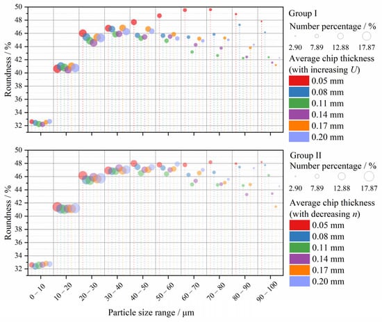 Roundness and quantity proportion for dust particles of 0–100 μm are shown in Figure 12, where positive correlations between roundness dispersion and average chip thicknesses appear in particles between 20 μm and 100 μm. However, there was no obvious correlation found between roundness and particle size. The Particles that were less than 20 μm with abnormally small roundness were seen as outliers that may have resulted from a low scanning resolution of about 7 microns/pixel so that the edges of small particles were replaced by sawtooth edges of the pixel lattice. Most of the roundness values for the smallest visible debris (10–50 μm) were below 48.0%.