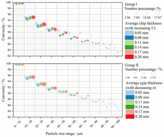 The convexities and number proportions of 0–100 μm dust particles are shown in Figure 14, where the convexity was negatively, linearly correlated with a particle size below 100 μm. Most of the convexities for the smallest visible debris (10–50 μm) were between 88.9%–99.6%. The convexity of the particles between 0–10 μm was close to 1, suggesting that these particles had almost no concave parts, which may be related to the regular shape of the smallest particles. On the other hand, it may also be related to low resolution of the equipment. Average chip thickness had less effect on the convexity instability of larger particles within 100 μm compared to the AR and roundness. These results suggest that the overall volatility in the convexity of bamboo dust was smaller than AR and roundness, and that the particles with low convexity had more complex flowability, making it difficult for them form a stable motion state in air.