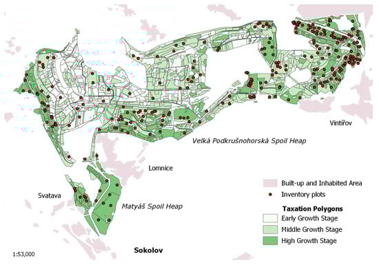 The geographical distribution of inventory plots and taxation polygons with corresponding growth stages of restored forest stands on the Velká Podkrušnohorská spoil heap and Matyáš spoil heap.