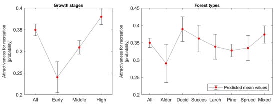 The mean recreation values—attractiveness for recreation—expressed as the mean probability of a person’s choice of a given type of restored forest for a one-hour walk are presented in Table A5 in Appendix B, with the highest recreation value for pine replantation and sites restored with spontaneous succession. Conversely, alder stands had a very low recreation value.