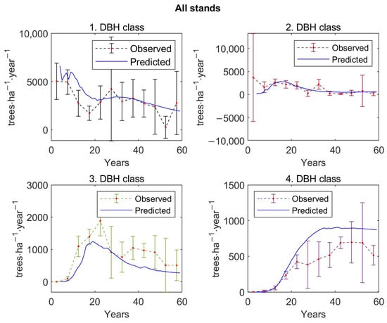 When predicting  during the simulations of the matrix model,  was replaced by , the midpoint of the corresponding DBH class , in Equation (9).