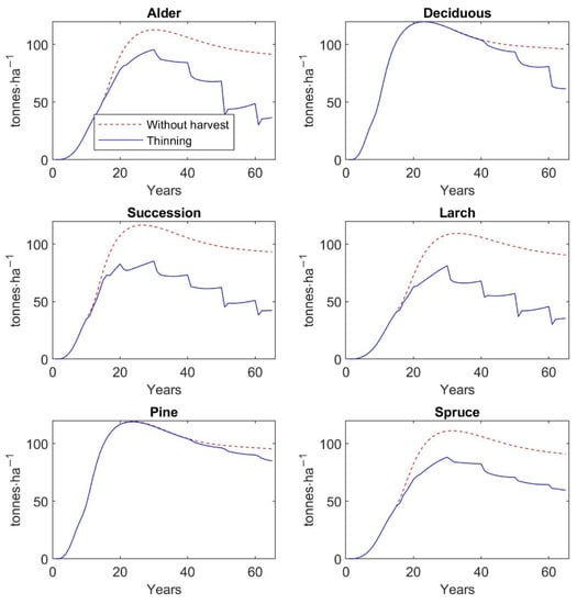 In the subsequent notations, t refers to time in years (,  to a type of restored forest stand, and  to a diameter class. We consider the model accounting for seven types of restored forests , as they are defined in the description of forest inventory survey. Specifically, we distinguish between alder, long-lived deciduous, spontaneous succession, larch, pine, spruce, and mixed coniferous–deciduous stands. Each stand is structured into four diameter classes  specified as follows: (i) 0–2 cm, (ii) 2–7 cm, (iii) 7–14 cm, and (iv) above 14 cm.