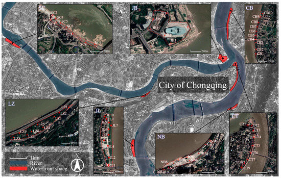 Chongqing is a typical mountainous city in Southwest China, where 90% of the total area is mountains and hills. Located on both sides of the Yangtze and Jialing Rivers, seven WSMCs in Chongqing were randomly selected as the study areas, namely, Jiangbeizui (JB), Shacixiang (SC), Chaotianmen Square (CT), CBD Riverside Park (CB), Liziba Park (LZ), Jiulongpo Park (JL), and Nanbin Park (NB). Figure 1 shows their plans and the locations of walking points in Chongqing (JB: 6 points; SC: 9 points; CT: 9 points; CB: 10 points; LZ: 9 points; JL: 10 points; and NB: 10 points). The walking routes align with the main touring route in each WSMC. Table 1 provides basic information about the study areas.