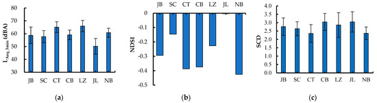 Figure 4 shows the mean values of the soundscape evaluation parameters (LAeq_5min, NDSI, and SCD) at walking points in seven WSMCs. It can be seen that the overall LAeq-5min of WSMCs was high (Figure 4a). In fact, the LAeq-5min values of the six WSMCs and 79% of the walking points were higher than 55 dBA, exceeding the national recommended value (daytime, city park, and green space) [47]. All NDSIs of WSMCs were negative, ranging from −0.425 to −0.004 (Figure 4b). This indicates that human disturbance was dominant in the WSMCs. The NDSI was the highest (−0.004) in JL and the lowest (−0.425) in NB. This might be related to the fact that JL is located in the old town and the pedestrian flow was low, while NB is located in a popular scenic spot and the pedestrian flow was high. The SCD of the seven WSMCs was in the range of 2.4–3.0, between “a little uncomfortable” and “moderate” (Figure 4c). Specifically, only 31.7% of the walking points were positively evaluated in terms of the SCD. In general, the soundscape evaluations of WSMCs were of poor quality.