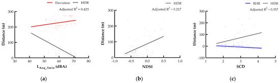 Linear regression curves between spatial indicators and soundscape evaluation parameters are shown in Figure 5. It can be seen that when the HDR was above 90 m, the LAeq_5min could drop below 55 dBA; when the elevation was below approximately 220 m, the LAeq_5min of WSMCs could drop below 55 dBA (Figure 5a). In terms of the NDSI, when the HDR was more than 90 m, the NDSI became positive (Figure 5b). This indicates that, at this distance, there was a higher proportion of biological sounds, and a better ecological status could be achieved. In terms of the SCD, this study found that when the HDR was more than 70 m, or the VDR was less than −10 m, the evaluation of the SCD was higher than moderate (evaluation = 3). Small changes in the vertical distance could result in large variances in the SCD (Figure 5c).