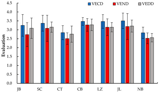 Results of VECD, VEND, and VEDD in seven WSMCs. VECD = visual environment comfort degree; VEND = visual environment natural degree; VEDD = visual environment diversity degree.