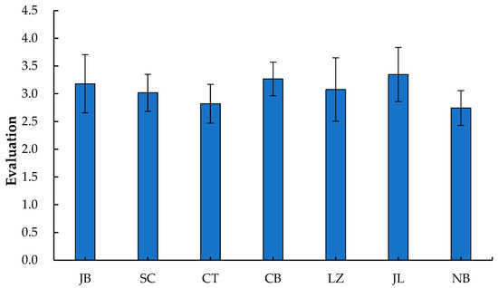 According to common odor sources in the city [49], the odors identified by the participants during the sensewalk were classified into five categories: natural odors, emission odors, food odors, building material odors, and human odors (Table 7). It can be seen that, in the WSMCs, the proportion of natural odors was the highest, with an average of 66.2%. The second highest proportion was emission odors, ranging from 7.5% to 32.3%. The proportions of food odors, building material odors, and human odors were lower, no more than 6%. In terms of the subjective evaluation of the smell environment, the results of the SECD in seven WSMCs are shown in Figure 7. It can be seen that the SECDs were higher with a large proportion of natural odors (such as CB and JL) and lower with a large proportion of emission odors (e.g., CT). In general, the scores of the SECD ranged from 2.7 to 3.3, and the five WSMCs’ SECD evaluation results were higher than 3 (moderate).