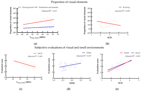 Linear regression curves between the proportion of visual elements and soundscape evaluation parameters, and subjective evaluations of visual and smell environments and soundscape evaluation parameters: (a) the proportion of visual elements and LAeq_5min; (b) the proportion of visual elements and SCD; (c) subjective evaluations of visual and smell environments and LAeq_5min; (d) subjective evaluations of visual and smell environments and NDSI; (e) subjective evaluations of visual and smell environments and SCD.