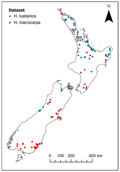 Plot area and measurement age were recorded along with diameter at 1.4 m breast height (DBH, cm) for all stems and stem heights for a sample of trees. Plot area averaged 0.043 ha (range 0.008–0.25 ha). Age ranged from 2–77 years, while stem volume averaged 229 and 178 m3 ha−1 for H. macrocarpa and H. lusitanica, respectively, and MTH averaged 14.8 and 14.4 m for H. macrocarpa and H. lusitanica, respectively (Table 1). Plots were well distributed across New Zealand (Figure 1), covering a wide range in derived (see later methods) SI, defined as MTH (mean top height) at age 30 years (range 8.8–33.6 and 12.5–36.1 m for H. lusitanica and H. macrocarpa, respectively) and 300 Index (range 0.44–29.6 and 0.73–31.3 m3 ha−1 year−1 for H. lusitanica and H. macrocarpa, respectively). Similar growth rates have been recorded for H. lusitanica in southern Brazil, with mean annual volume increments ranging from 6–31 m³ ha−1 year−1 at ages of 16–18 years [47], while somewhat lower yields of 6–17 m3 ha−1 year−1 were reported in Ethiopia at ages 25 to 34 years [43].