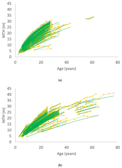 Mean top height (MTH) vs. age for (a) H. lusitanica and (b) H. macrocarpa. Orange lines and dots indicate measurements, and green lines show predictions using Equation (14) projected from the initial measurement in each plot.
