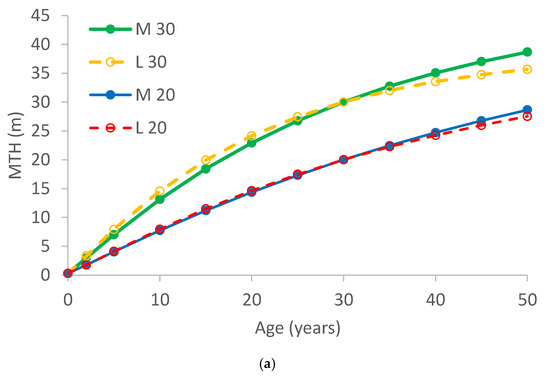 The models can be used to predict MTH (m) at age t (years) from an initial measurement MTH0 at age t0, as shown by Equation (14). By setting MTH0 to SI and t0 to 30, Equation (14) predicts MTH for any age t from SI. Figure 2 shows the predictions using the initial measurement in each plot plotted against age along with the measured values.