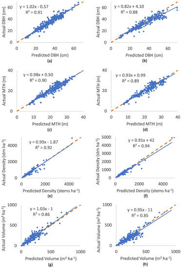 The parameter estimates for the stand-level volume function Equation (10) are given in Table 10. Because the volume model explained 99.9% of the variation in ln(V), transformation bias can be considered negligible (e.g., the transformation correction ratio based on the residual standard deviation s is exp(s2/2) = 1.0004). The parameter estimates for Equation (13), which predicts MTH from mean height, are shown in Table 11.