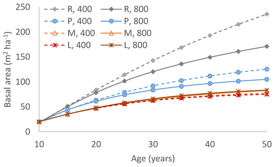 Predicted basal area of redwood (R), radiata pine (P), Hesperocyparis macrocarpa (M) and H. lusitanica (L) projected from a starting value of 20 m2 ha−1 at age 10 years for stand densities of 400 and 800 stems ha−1.