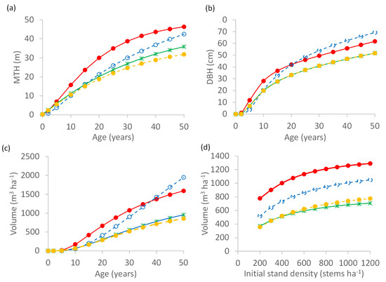 Comparison of growth model predictions for radiata pine (solid red line and dots), redwood (dashed blue line and circles), H. macrocarpa (solid green line and stars) and H. lusitanica (dashed orange line and dots). Shown are (a) men top height (MTH), (b) diameter at breast height (DBH) and (c) stem volume vs. age for stands established at 500 stems ha−1, and (d) stem volumes vs. initial stand density at age 30 years. The predictions are based on average values of I300 and SI of each species for the North Island of New Zealand. For radiata pine, I300 = 29.3 m3 ha−1 year−1 and SI = 30 m (age 20). For redwood, I300 = 22.7 m3 ha−1 year−1 and SI = 30 m [15]. For H. macrocarpa, I300 = 15.6 m3 ha−1 year−1 and SI = 26.9 m. For H. lusitanica, I300 = 14.1 m3 ha−1 year−1 and SI = 24.7 m [67].