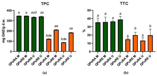 (a) Total phenolic content (TPC) of the oak bark extracts. (b) Total tannin content (TTC) of the bark extracts; different letters indicate significant differences. qPeRA M—Q. petraea bark extract obtained by aqueous MAE; qPeRE M—Q. petraea bark extract obtained by ethanolic MAE; qPeRA U—Q. petraea bark extract obtained by aqueous UAE; qPeRE U—Q. petraea bark extract obtained by ethanolic UAE; qPuRA M—Q. pubescens bark extract obtained by aqueous MAE; qPuRE M—Q. pubescens bark extract obtained by ethanolic MAE; qPuRA U—Q. pubescens bark extract obtained by aqueous UAE; qPuRE U—Q. pubescens bark extract obtained by ethanolic UAE. Results are expressed as mg GAE/g d.w (dry weight) (TPC) and as percentage of the TPC (TTC).