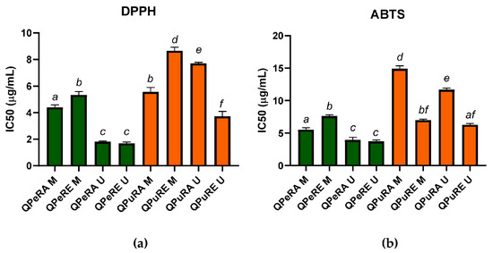 (a) Antioxidant capacity (DPPH method); (b) antioxidant capacity (ABTS method); different letters indicate significant differences. qPeRA M—Q. petraea bark extract obtained by aqueous MAE; qPeRE M—Q. petraea bark extract obtained by ethanolic MAE; qPeRA U—Q. petraea bark extract obtained by aqueous UAE; qPeRE U—Q. petraea bark extract obtained by ethanolic UAE; qPuRA M—Q. pubescens bark extract obtained by aqueous MAE; qPuRE M—Q. pubescens bark extract obtained by ethanolic MAE; qPuRA U—Q. pubescens bark extract obtained by aqueous UAE; qPuRE U—Q. pubescens bark extract obtained by ethanolic UAE. Results are expressed as µg freeze-dried extract/ mL solution (representing the IC50 value).