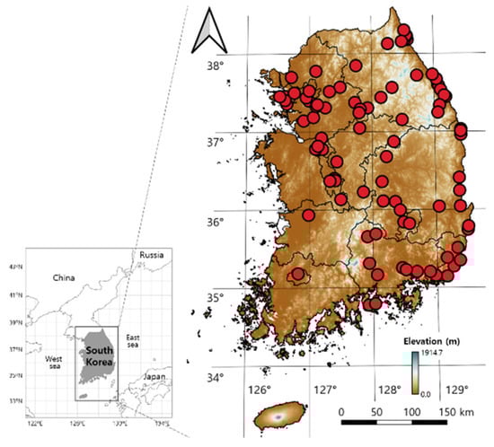 The occurrence records of WCSBs in South Korea were collected from the literature [12,27,28], field surveys, and the online database of the Global Biodiversity Information Facility [30]. To avoid spatial sampling bias, through spatial filtering (also called spatial rarefying) using a 5 km × 5 km grid scale, 90 WCSB occurrence sites were obtained (Figure 1).