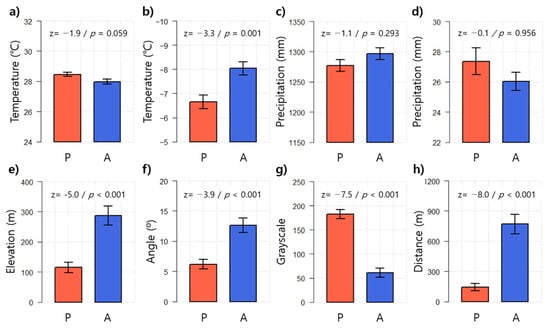 Comparison of environmental conditions between the presence (P) and absence (A) sites of WCSBs. The z-score (z) and p-value (p) were calculated based on test statistics (U) of the Mann–Whitney U test. The bars and error bars represent the mean and standard error of each variable. (a) Maximum temperature of the warmest month, (b) minimum temperature of the coldest month, (c) annual precipitation, (d) precipitation of driest month, (e) elevation, (f) slope, (g) night light, (h) distance to the road.
