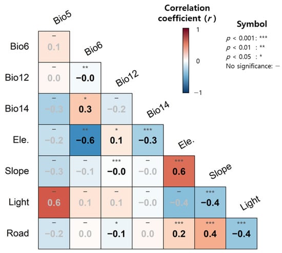 In this study, eight selected variables were used to avoid multicollinearity among the whole environmental variables: elevation, slope, night light, distance to road, the maximum temperature of the warmest month (Bio5), the minimum temperature of the coldest month (Bio6), annual precipitation (Bio12), and precipitation of the driest month (Bio14). These variables were selected considering the value of Pearson’s correlation coefficient (r < 0.9) and variation inflation factor (VIF < 5). Although isothermality (Bio3) was also passed, we excluded Bio3 based on the ecological characteristics of WCSB, low variation in South Korea, and other studies on the SDM of WCSB [10,29,34].