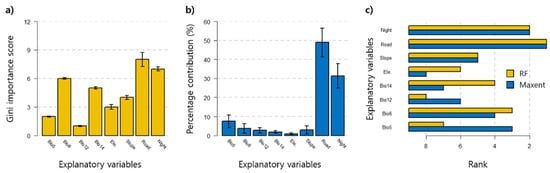 The major variables affecting WCSB prediction differed between the two models (Figure 4). Although both SDMs presented the anthropogenic variables (i.e., distance to road and night light) as the most important variables for predicting WCSB occurrence, the influence of these variables was very large compared to other variables in the MaxEnt model. However, in the RF model, the minimum temperature of the coldest month (Bio6) and the precipitation of the driest month (Bio14) were also influential. These differences of variable importance between SDMs are displayed in the importance ranks (Figure 4c). As described above, although the first and second most important variables were the same in both the RF and MaxEnt models, the influential variables were different in each model. Except for the anthropogenic variables, the temperature variables strongly affected the results of the MaxEnt model. However, in the RF model, meteorological and geographic variables, such as temperature, precipitation, and elevation, were all shown to affect WCSB prediction in the model.