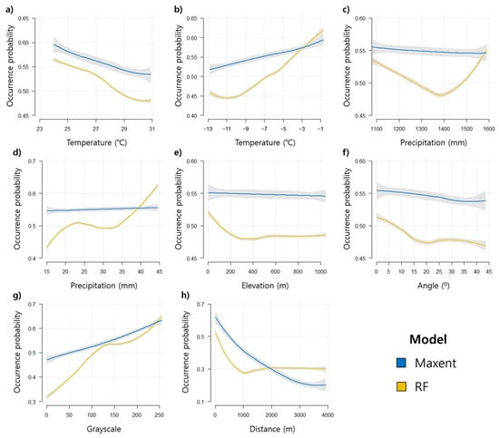 The response trends to environmental variables were not different in the PDPs of both the SDMs (Figure 5). However, the degree of increase or decrease differed depending on the model. As the maximum temperature of the warmest month was lower and the minimum temperature of the coldest month was higher, the probability of occurrence of WCSBs increased in both models. Regarding precipitation, although the occurrence probability in the MaxEnt model showed little change, the probability in the RF model decreased when the annual precipitation was 1100 mm and 1384 mm or the precipitation of the driest month was lower. The occurrence probability in the MaxEnt model showed little change in geographical variables (elevation and slope) such as precipitation. However, when the elevation was lower than 345 m or the slope was lower than 20°, the probability of occurrence increased in the RF model. Additionally, as the night light became brighter and the road became closer, the occurrence probability of WCSBs increased in both the SDMs. In particular, in the RF model, the WCSB occurrence probability decreased until the distance to the road reached 1000 m.