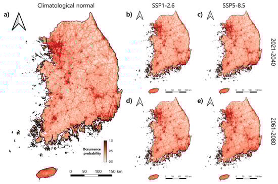 By integrating the results of the two models, a potential occurrence probability map for WCSBs, known as the occurrence risk map, was produced (Figure 6a). Particularly, the occurrence probability was predicted to be high in metropolitan cities and their vicinities, such as Seoul, Incheon, Daegu, Daejeon, and Gwangju metropolitan cities in South Korea (Figure S1). Furthermore, Jeju Island and the northern area of the east coast, including Gangneung city, showed a high probability of WCSB occurrence. Using the model ensemble and future climate data, the change in the risk of WCSB occurrence due to climate change was predicted (Figure 6b–e). Due to climate change, the WCSB occurrence risk intensified with time flow (present → near future (2021–2040) → far future (2061-2080)) and magnitude of radiative forcing (SSP1-2.6 → SSP5-8.5) at the national scale (Figure S2). In the near future, the possibility of WCSB occurrence increased nationwide compared to the present, and the degree of increase was larger for SSP5-8.5 than that for SSP1-2.6 (Figure 6b–c). In both scenarios, it was predicted to be increased in Seoul metropolitan city, Gyeonggi-do (in the Korean administrative unit, -do is a province), and southern regions of South Korea (Figure S3a–b). The occurrence risk of WCSBs would be increased more in the far future with SSP5-8.5 data than that with SSP1-2.6 data (Figure 6d–e). In particular, it would be increased significantly in the mountainous region of the southern area of Korea (Jeolla-do and Gyeongsang-do) and the eastern coast of South Korea. Although the possibility of WCSB occurrence in the future (near future → far future) did not change much under the SSP1-2.6 scenario, the potential occurrence risk of WCSB increased significantly under the SSP5-8.5 conditions (Figure S3c–d). Furthermore, many areas in South Korea have shown vulnerability to climate change during WCSB occurrence (Figure S4). The more severe the global warming, the greater the possibility of WCSB occurrence in the future, except in high-mountainous regions. In particular, the plain in Chungcheongnam-do and the eastern coastal region of South Korea is greatly affected.