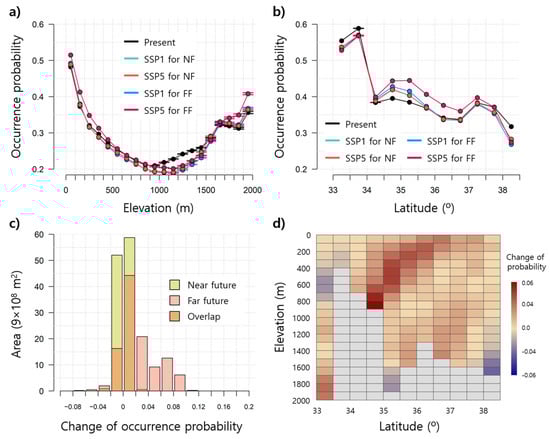 The effects of climate change on the occurrence of WCSBs in South Korea. All values in the figure are interval values. Change in the occurrence risk of WCSBs according to (a) elevation and (b) latitude (NF: near future (2021–2040); FF: Far future (2061-2080)). (c) Impacts of intensified climate change in the future. (d) Change in the occurrence risk of WCSBs between climate change scenarios in the far future. The degree of change in the near future and the far future (c,d) was obtained by subtracting probability under SSP5-8.5 from probability under SSP1-2.6. Grids with gray color mean no data.