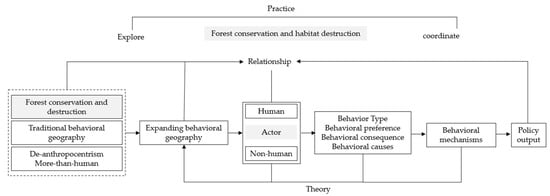 When forests are destroyed, the animals and plants present are affected to varying degrees [25]. From the perspective of behavioral geography, this paper explores the behavior of Asian elephants during their northward migration and their relationship with the geographical environment [26]. Traditional behavioral geography is based on human beings as the basic object of study, which is inextricably linked to the long-standing prevalent anthropocentrism. Traditional anthropocentrism believes that nature and all things exist to serve and be used by human beings and that in the relationship between human beings and nature, everything must start and end with the interests of human beings. This view once influenced social practices and academic orientation. However, as environmental problems become increasingly serious, some scholars have begun to rethink the relationship between humans and non-humans, proposing new ethical concepts, such as “De-anthropocentrism” and “More-than-human” [27,28,29,30]. Under the new ethical orientation, behavioral geography should no longer be confined to humans, and its attention on non-human actors should be strengthened. Under the current background of increasingly intensified “human–animal conflicts,” behavioral geography research on wild animals is attracting increasing attention. Therefore, this study applied an expanding behavioral geography framework (Figure 1) to analyze the northward migration behavior of Asian elephants. Based on identifying Asian elephants as behavioral actors, this study focuses on summarizing the behavioral types, behavioral preferences and their relationship with the environment, behavioral consequences, and behavioral causes and further explores the inner mechanism of the northward migration behavior of Asian elephants. This study attempted to answer the following questions: What are the factors that drove the migration? What are the behaviors of Asian elephants during their northward migration? What are the behavior choice preferences of Asian elephants during their northward migration?