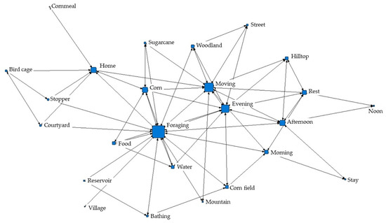 The different behaviors of Asian elephants indicate their behavioral choice preferences, including behavior preferences, time preferences, and environmental preferences. The key behavior of Asian elephants during their northward migration is foraging. According to the Table 7, the average degree centrality of Asian elephant migration behavior keywords is 9.280, and the degree centrality of 7 nodes is higher than the average. Foraging has the highest degree centrality of 40, which is the core keyword of Asian elephants’ northward migration. According to the Figure 2, Asian elephants often forage in villagers’ homes or woodlands during their northward migration. Asian elephants often rested on the top of the mountain or in the forest at noon, foraged, and moved in the afternoon or at night. The Asian elephants that moved north preferred corn, sugarcane, so corn field and villagers’ home warehouses were often their first choice of foraging grounds.