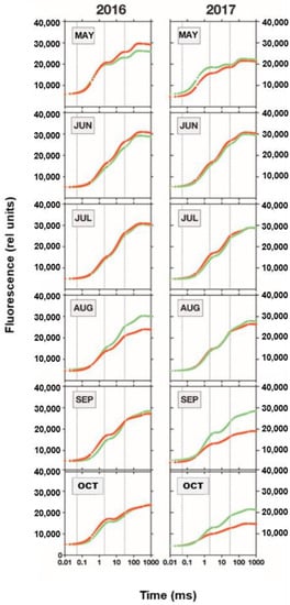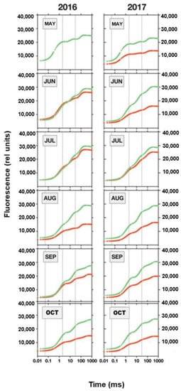 - Matsubara, S.; Chow, W.S. Populations of photoinactivated photosystem II reaction centers characterized by chlorophyll a fluorescence lifetime in vivo. Proc. Natl. Acad. Sci. USA 2004, 101, 18234–18239. [Google Scholar] [CrossRef]