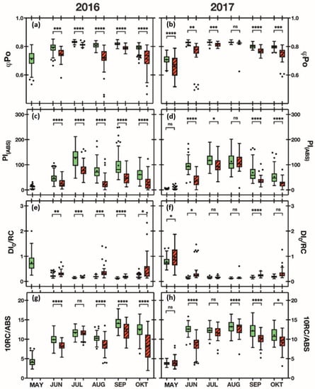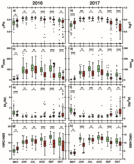 | RC/ABS = φPo (VJ/M0) | QA reducing (active) RCs per PSII antenna Chl; measure for the activity of reaction centers. |