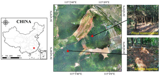 Location of the study area and sampling sites in the Pinus massoniana and Schima superba plantations.