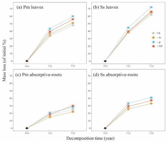 For absorptive roots litter, +N significantly inhibited the early-stage mass loss of Pm and early- and later- stage mass loss of Ss (Figure 2c,d and Table 3 and Table S1). +P significantly stimulated the root decomposition of the two species in the late stage (Figure 2c,d and Table 3 and Table S1). The +NP treatment had a negative effect on the Ss root decomposition in the late stage (Figure 2c,d and Table 3 and Table S1). For the leaf litter, +N significantly stimulated the early-stage decomposition of Pm (Figure 2a,b and Table S1). Compared to the CK treatments, the foliar mass losses in both species were significantly higher in the +P and +NP treatments throughout the decomposition process (p < 0.05), except for the early-stage decomposition of Ss leaf litter in the +NP treatment (Figure 2a,b and Table 3 and Table S1).