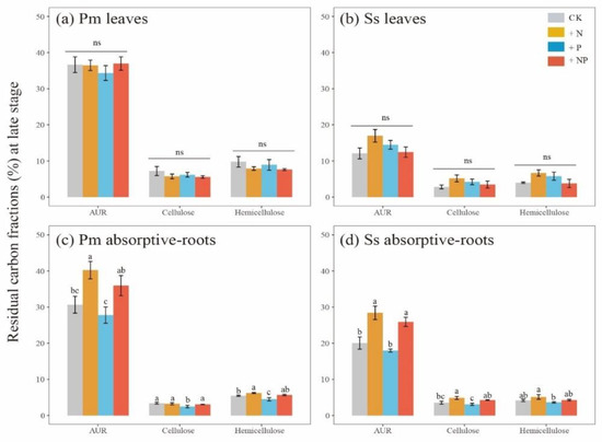 Concentrations of residual carbon fractions in four substrates under different treatments in the 3-year stage of decomposition. Carbon fractions include AUR, cellulose, and hemicellulose. Values are the mean ± SE (n = 4). Significant differences between means were determined using Tukey’s honestly significant difference test. Different letters indicate significant differences among treatments (p < 0.05). CK, control; +N, nitrogen addition; +P, phosphorus addition; +NP, combined additions of nitrogen and phosphorus; AUR, acid-unhydrolysable residue; Pm, Pinus massoniana; Ss, Schima superba.