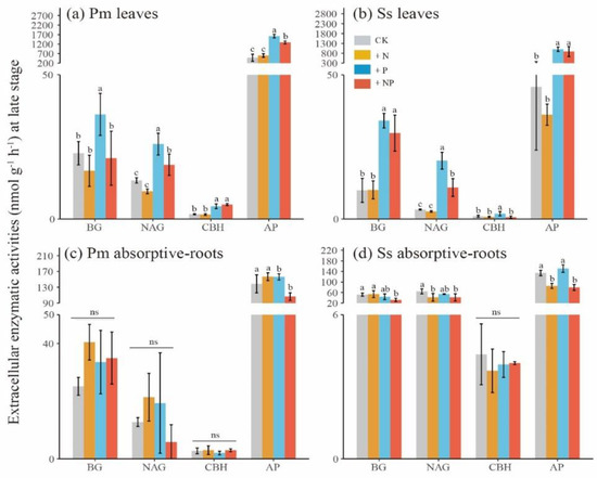 Activity of four microbial hydrolase extracellular enzymes in four substrates under different treatments in the 3-year stage of decomposition. Values are the mean ± SE (n = 4). Significant differences between means were determined using Tukey’s honestly significant difference test. Different letters indicate significant differences among treatments (p < 0.05). CK, control; +N, nitrogen addition; +P, phosphorus addition; +NP, combined additions of nitrogen and phosphorus; BG, β-1,4-glucosidase; NAG, β-1,4-N-acetylglucosaminidase; CBH, cellobiohydrolase; AP, acid phosphatase; Pm, Pinus massoniana; Ss, Schima superba.