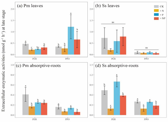 Activity of two microbial oxidase extracellular enzymes in four substrates under different treatments in the 3-year stage of decomposition. Values are the means ± SE (n = 4). Significant differences between means were determined using Tukey’s honestly significant difference test. Different letters indicate significant differences among treatments (p < 0.05). CK, control; +N, nitrogen addition; +P, phosphorus addition; +NP, combined additions of nitrogen and phosphorus; PER, peroxidase; PPO, polyphenol oxidase; Pm, Pinus massoniana; Ss, Schima superba.