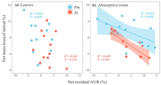 Relationships between the net residual AUR concentration and net mass loss for decomposing leaves and absorptive roots in the 3-year stage of decomposition. ‘Net values’ were calculated by deducting the residual AUR concentration or mass loss of the control treatment from that of the nutrient-addition treatments. Different nutrient treatments were pooled, n = 12, p < 0.05. AUR, acid-unhydrolysable residue.