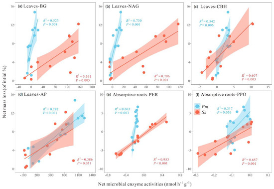 Relationships between the net microbial enzyme activity and net mass loss for decomposing leaves and absorptive roots in the 3-year stage of decomposition. ‘Net values’ were calculated by deducting the enzyme activity or mass loss of the control treatment from that of the nutrient-addition treatments. Different nutrient treatments were pooled, n = 12, p < 0.05. BG, β-1,4-glucosidase; NAG, β-1,4-N-acetylglucosaminidase; CBH, cellobiohydrolase; AP, acid phosphatase; PER, peroxidase; PPO, polyphenol oxidase.