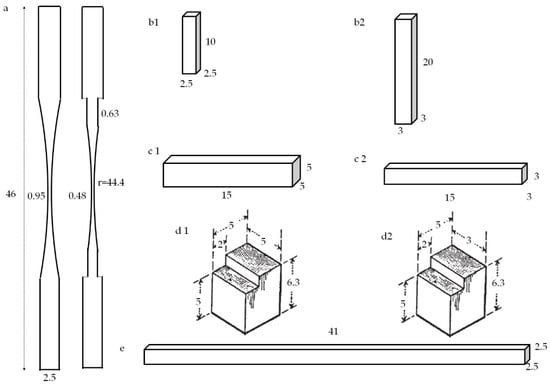 Timber and scrimber specimens for tensile test parallel-to-fiber (a), timber (b1) and scrimber (b2) specimens for compressive test parallel-to-fiber, timber (c1) and scrimber (c2) specimens for compressive test perpendicular to fiber, timber (d1) and scrimber (d2) specimens for shear test, timber and scrimber specimens for bending test (e). (Note: the size unit is cm).