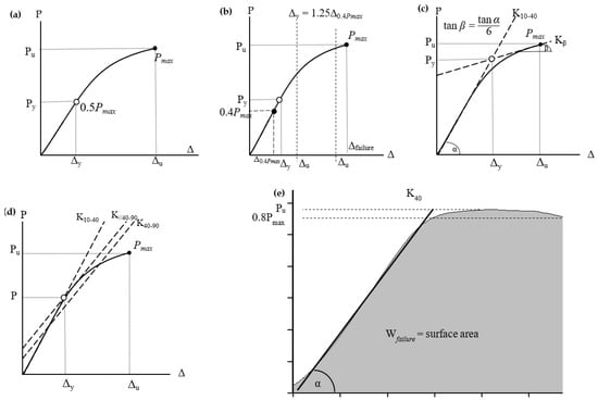 - Equivalent Energy Elastic-Plastic (EEEP) [57]: In this method, a bilinear curve represents an assembly’s perfect elastic-plastic curve (Figure 2e). The area under the load-displacement curve (Wfailure) is assumed to be the same as the area beneath the bilinear curve. Initial stiffness in this method corresponds to the first straight line, which is defined as being between 0% and 40% of the peak load (K40). Deformation at failure (∆failure) is defined as deformation at 80% of maximum load. The following equation is used to calculate the yield load (Py) is Equation (3).