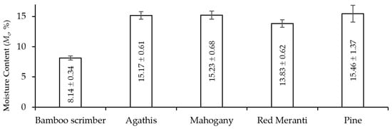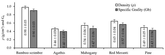 The scrimber and timber’s average density and specific gravity are presented in Figure 4. The density varies between 0.46 and 0.98 g/cm3. The specific gravity (Gb) is determined based on oven-dried mass and air-dried volume. The Gb values range between 0.40 and 0.90. In both cases, agathis has the lowest value, while scrimber is the densest. Both scrimber and timber are hygroscopic materials that absorb water from their surrounding environment; thus, their masses relate to moisture content. The higher Gb value means the total hollow cavity volume decreases; this explains the scrimber’s lower moisture content than timber. The scrimber is denser than the other timbers. The lower moisture content of scrimber also indicates the less available void for free water [62].