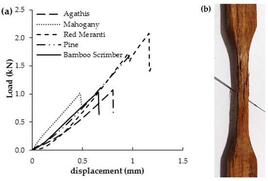 The mean value for tension strength parallel-to-fiber of the scrimber is 34.27 MPa (Table 3). This value is lower than Kumar et al.’s report [35], which equals 111 MPa for scrimber. The tensile strength parallel-to-fiber of the scrimber is the weakest among other materials, while the strongest was red meranti (128.48 MPa). Bamboo scrimber used in this study was not flattened and crushed using an excellent machine for the defibering process but the simple manual one. It will cause the bamboo strips to not have well-maintained fiber direction longitudinally. At the same time, it is supposed to be horizontally maintained to decrease the mechanical properties, especially in tension parallel to the fiber. Huang et al. [36] reported that early defibering was mainly hand-made, using manual hammering and roll-in. However, the former method could cause mechanical damage to bamboo. Figure 5a shows a sample of the load-displacement curve in tension test parallel-to-fiber of each material. The load-displacement curves generally had a linear relationship with increasing load until the final failure. Thus, the proportional limit is near the ultimate load. Failures found in scrimber specimens are along with the bamboo fiber (Figure 5b).